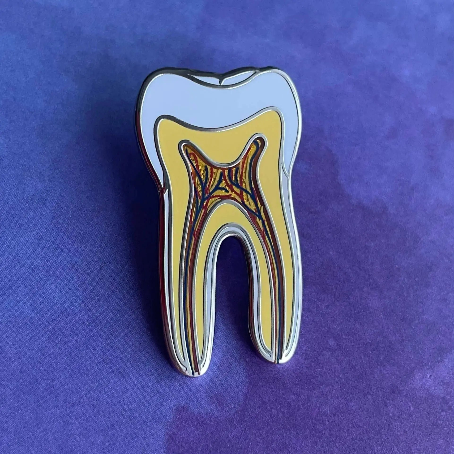 - Tooth anatomy pin - 1.3" tall - silver nickel - Scaler pin - 2.25" long