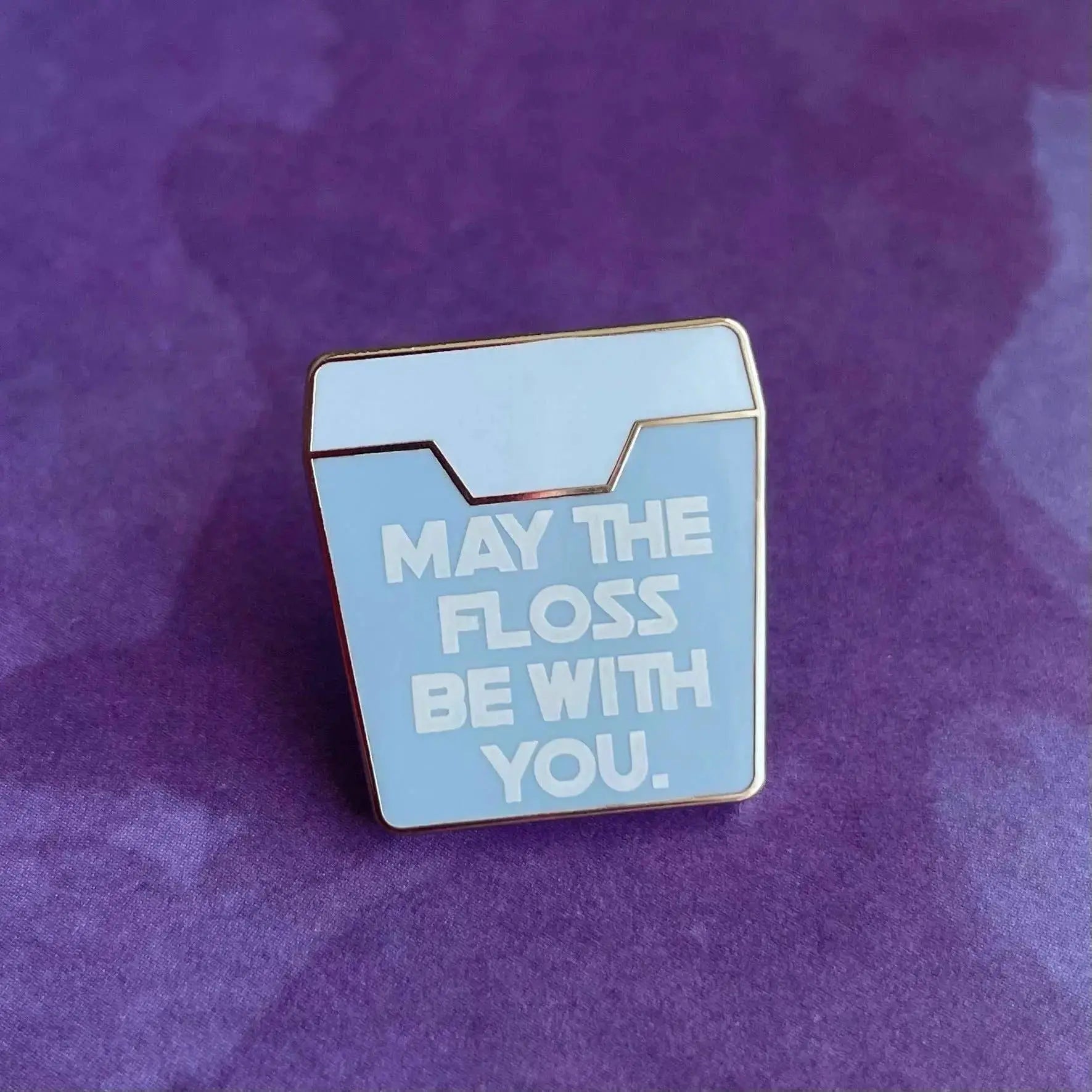 - May the floss be with you pin - .75" tall - silver nickel - white screenprinting
