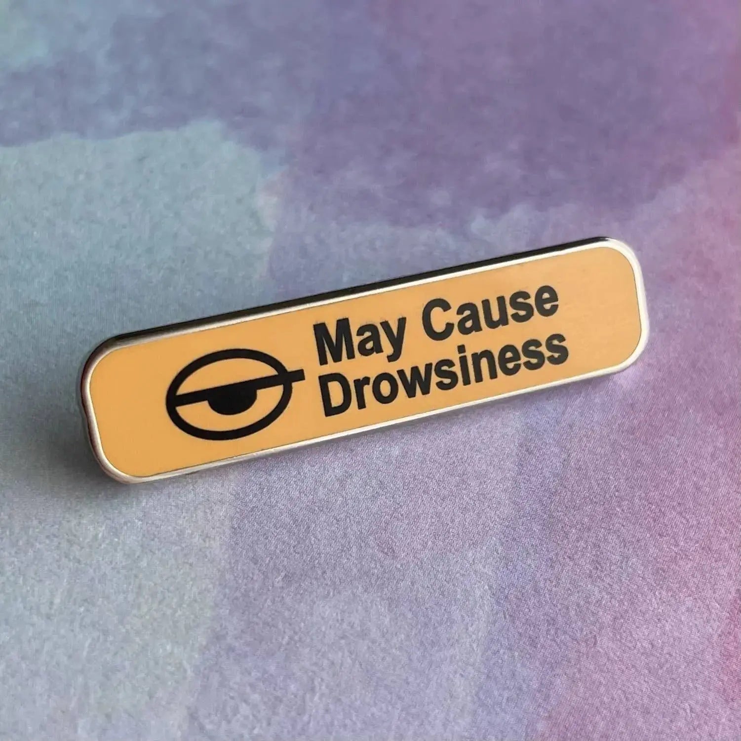 - May Cause Drowsiness Pin - 1.4" wide - silver nickel - hard enamel with screen printing.